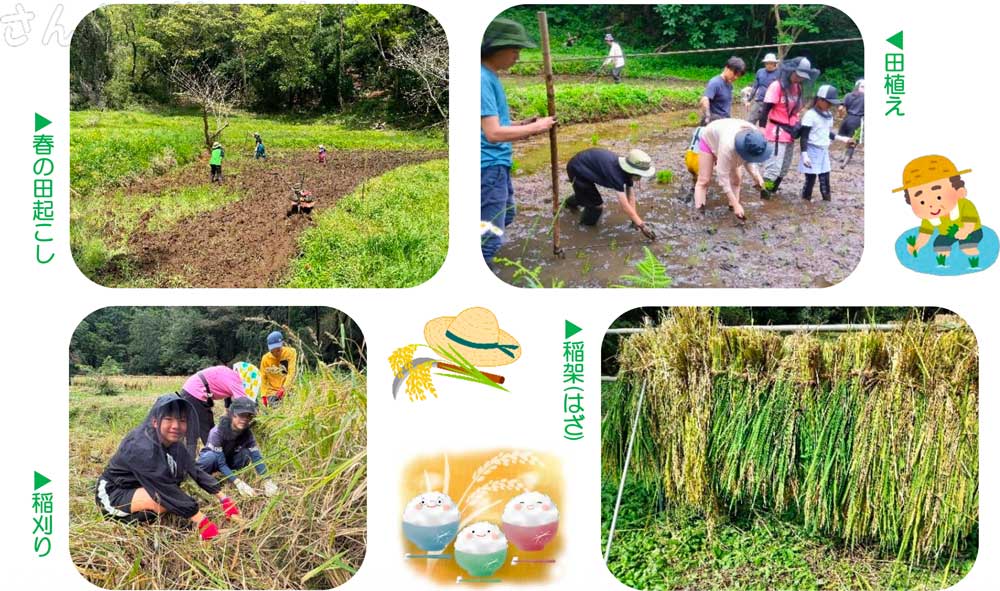 里山の谷戸(やと:谷間のこと)にある「田んぼ」を借り受けて、お米作りにも挑戦しています。おとなも子どもも一緒に「田んぼファミリー」を組んで、代掻き、田植え、田の草取り、稲刈り、脱穀、籾摺りにいたる1年がかりのプログラムです。収穫したお米(もち米)でメンバー総出の餅つきをして1年が終わります。
